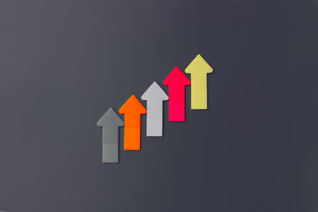 Colorful paper arrows pointing up on gray background. Top view