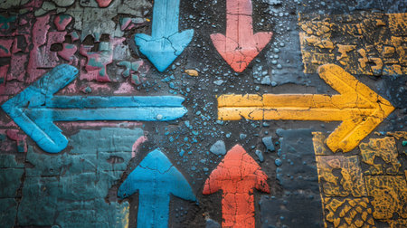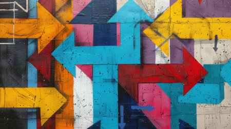 This image features a vibrant abstract mural showcasing colorful directional arrows on a textured wall, perfect for artistic and urban-themed projects.