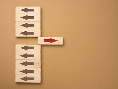 wooden blocks with brown arrows in one direction and one block with a red arrow in the opposite direction. Concept of difference, uniqueness of thinking, not like everyone else