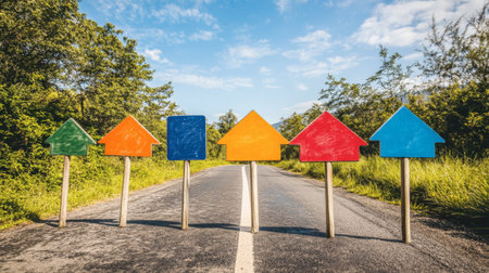 A set of vibrant house-shaped signs stands along a quiet roadside, surrounded by lush greenery, offering a colorful touch to the peaceful landscape.