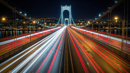 Blue lit suspension bridge at night with vibrant car light trails creating a dynamic urban scene