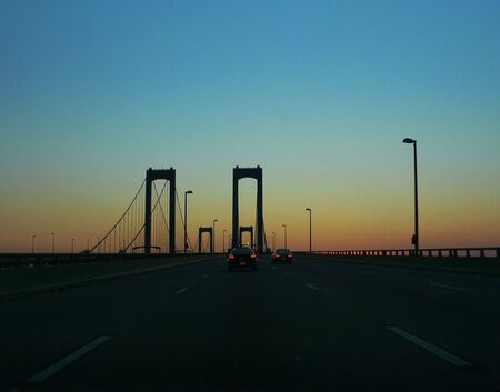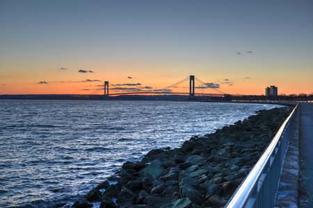 A view of the Verrazano Narrows Bridge in New York City at sunset. The Verrazano Narrows Bridge is a double decked suspension bridge that connects Staten Island and Brooklyn in New York City, USA.