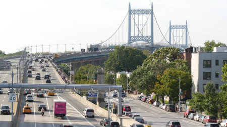 New York City, United States - 2 Sept 2023: Triborough Bridge in Astoria, Robert F. Kennedy Bridge. Car traffic on road, multiple lane transport highway from subway station in Queens, Ditmars Steinway