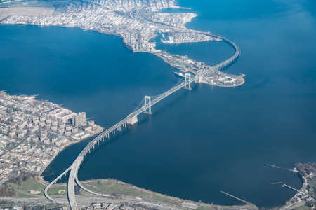 Aerial view with Verrazano-Narrows Bridge over Upper Bay and Lower Bay. It connects Brooklyn and Staten Island. Manhattan Area, New York of USA. United States of America, NYC, US.