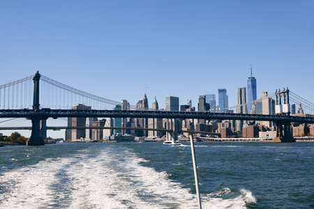 A view of the New York City skyline, including the Brooklyn Bridge, from a boat on the East River.