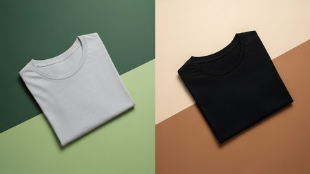 A top-down view of two folded, blank crew-neck t-shirts, one light gray and one black, arranged on a modern, diagonally split, multi-color background, ideal for apparel mockups.