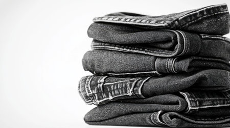 A monochrome image showcasing neatly stacked denim jeans, emphasizing their textured fabric and classic appeal. Ideal for fashion and lifestyle themes.