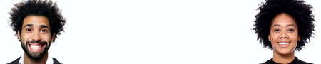 Two people in front of a white background with a white space in between