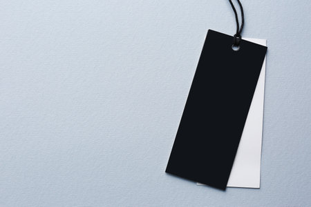 Tags with space for text on light gray background, top view