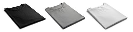 White, gray and black folded t-shirts isolated on white. Mockup for design