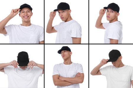 Young man wearing stylish black baseball hat on white background. Collage of photos
