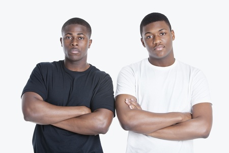 Portrait of two African American male friends with arms crossed over gray background