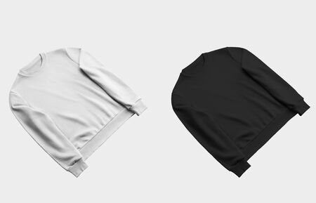 Presentation of a laid out white, black sweatshirt, mockup blank texture pullover isolated on a background. Template casual male clothes for advertising in an online store. Set with place for design