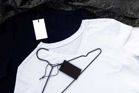 Mockup of a set of white and blue cotton t-shirts, on a black hanger with a black tag on a thread. Close-up of the collar. T-shirt template design, presentation mockup for print. Flat lay, top view.
