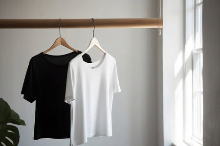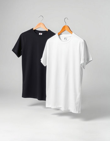 White and black t-shirts on hangers on a gray background