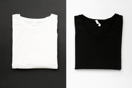 Folded black and white t-shirts on color background