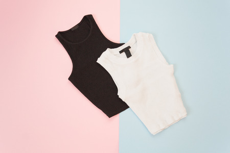 Fashionable concept. Black and white top on a gently pink and blue background