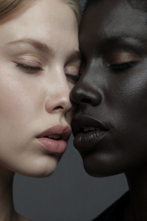 An AI-generated illustration of two beautiful women of different ethnicities sharing an intimate moment