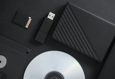 Outdated and modern digital storage media on black background