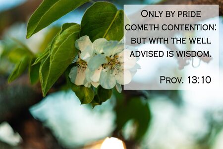 Bible quotes on blurred blooming nature background. Only by pride cometh contention: but with the well advised is wisdom. Card text sign for believers. Inspirational verse praying thought.