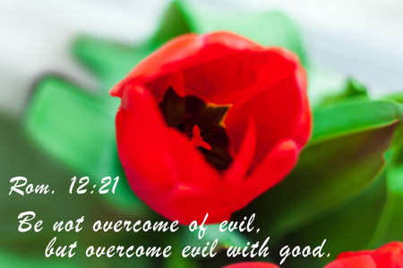 Bible quotes on blooming red tulip flower background. Card with text sign for believers. Inspirational verse thoughts. Christian verse text for praying.