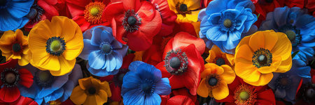 Red, blue and yellow poppies as background, top view