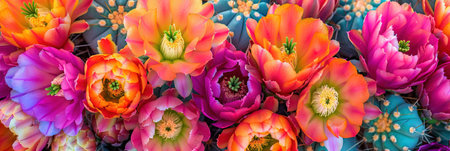Top view of colorful cactus flowers background. Copy space for text.