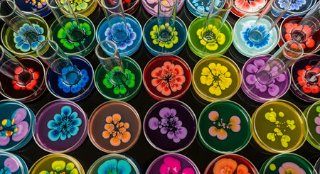 An overhead shot of numerous petri dishes filled with colorful agar, showing vibrant, flower-like bacteria or fungi cultures. Test tubes are placed in some dishes, suggesting a scientific experiment or research in a microbiology lab.