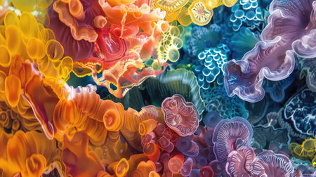 A colorful coral reef with many different colored sea creatures. The colors are bright and vibrant, creating a lively and energetic atmosphere