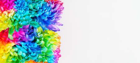 Bouquet of colored chrysanthemums on a white background close-up. Chrysanthemum is painted in rainbow colors. Banner. Copyspace.