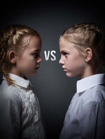 Two children with similar hairstyles face off in a dimly lit scene, highlighting conflict and bullying through their expressions.