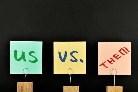 Us vs them, three paper notes, green, yellow, pink, with wooden holder isolated on black paper background for presentation