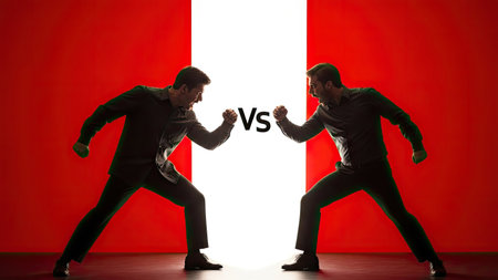 Two men stand poised in a confrontational stance, silhouetted against a bold red and white background. The composition features a strong central vertical element. The image utilizes dramatic lighting. Potential uses include illustrations about conflict, opposition, or competition, suitable for various editorial and commercial projects.