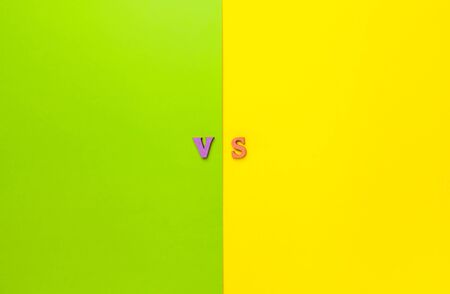 Letters VS on Yellow and Green paper background with copy space. The concept of making choice. Versus letters. Yellow and green background and wooden letters VS.