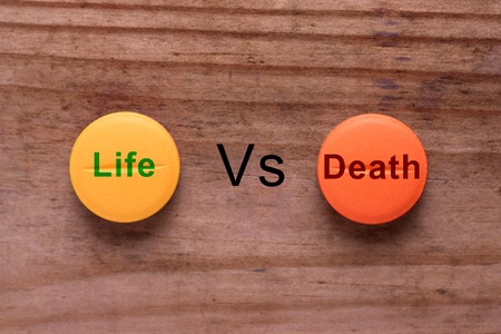 terminal illness treatment concept. pill with words life vs death
