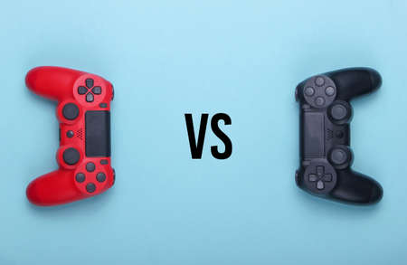 Gamer Championship, Versus. Two gamepads on a blue background. Top view