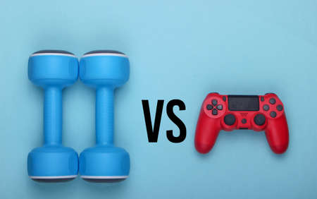 Sport or entertainment. Gamepad and dumbbell on a blue background. Versus. Top view