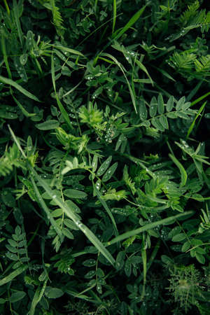 Green meadow grass with dew drops. Nature summer background. Top view