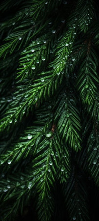Captivating close-up shot of dewy green leaves with water droplets, set against a dark backdrop, exemplifying the beauty of nature and tranquility.