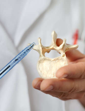 Closeup on a model of human vertebra in hand of a heath practitioner pointing at it.