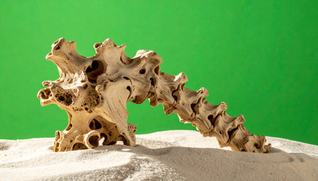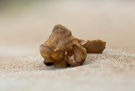 The weathered, arched spine of an ancient creature rests on pristine white sand, a relic of a bygone era.