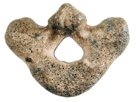 A detailed view of a fossilized vertebral column rests upon dark sediment, illustrating the ancient remains of a once-living creature.