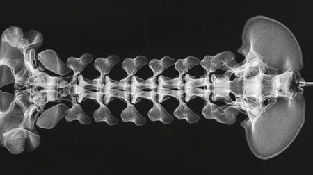 This visual depicts an x-ray image of a spinal column, showing individual vertebrae and their arrangement. The contrast reveals details of bone density and curvature.