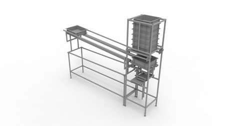 3D rendering of a stacking crate conveyor belt factory manufacturing installation machine, isolated on white background