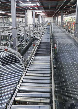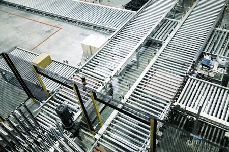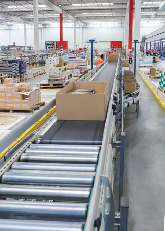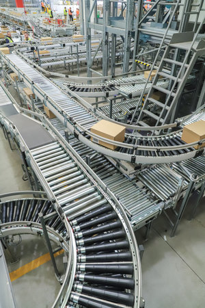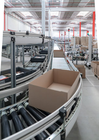 View of modern conveyor belts transporting boxes in a large warehouse ready for delivery