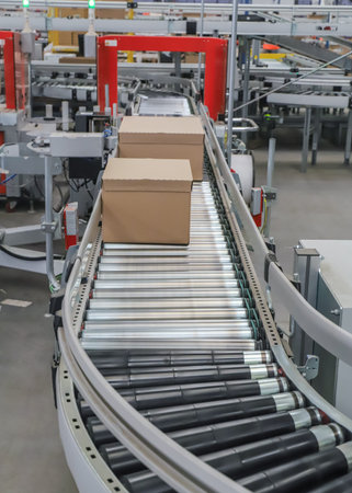 Conveyor belt with cardboard boxes in the factory. Industrial background