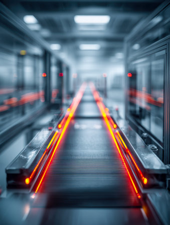 A cutting-edge industrial process unfolds with a radiant orange-lit transport line, set in a sleek metallic environment, emphasizing innovation and precision.