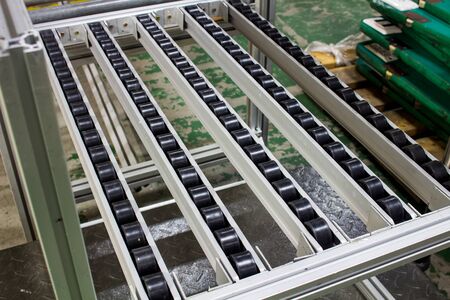 Conveyor belt system used in manufacturing process with metallic rollers in a production facility