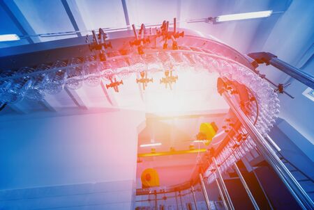 Beverage factory interior. Conveyor with bottles for juice or water. Equipments