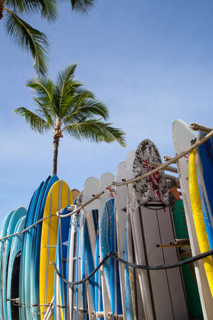 A vibrant display of colorful surfboards under a bright blue sky, evoking a sense of adventure and the essence of summer beach life. Perfect for promoting outdoor fun.